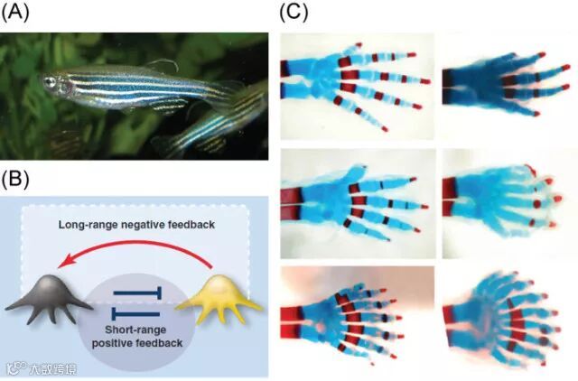 此后,陆续有生物学家在不同尺度的生命体系中发现图灵结构:斑马鱼体表的黑色和黄色色素细胞相互作用,在体表出现的条状斑图;小鼠生成毛囊的基因表达过程中存在反应-扩散过程,它决定着毛囊间距,影响着小鼠毛发的密度分布差异;鱼鳍内骨骼中指头的数目,也是几个基因因图灵机制产生的结果。