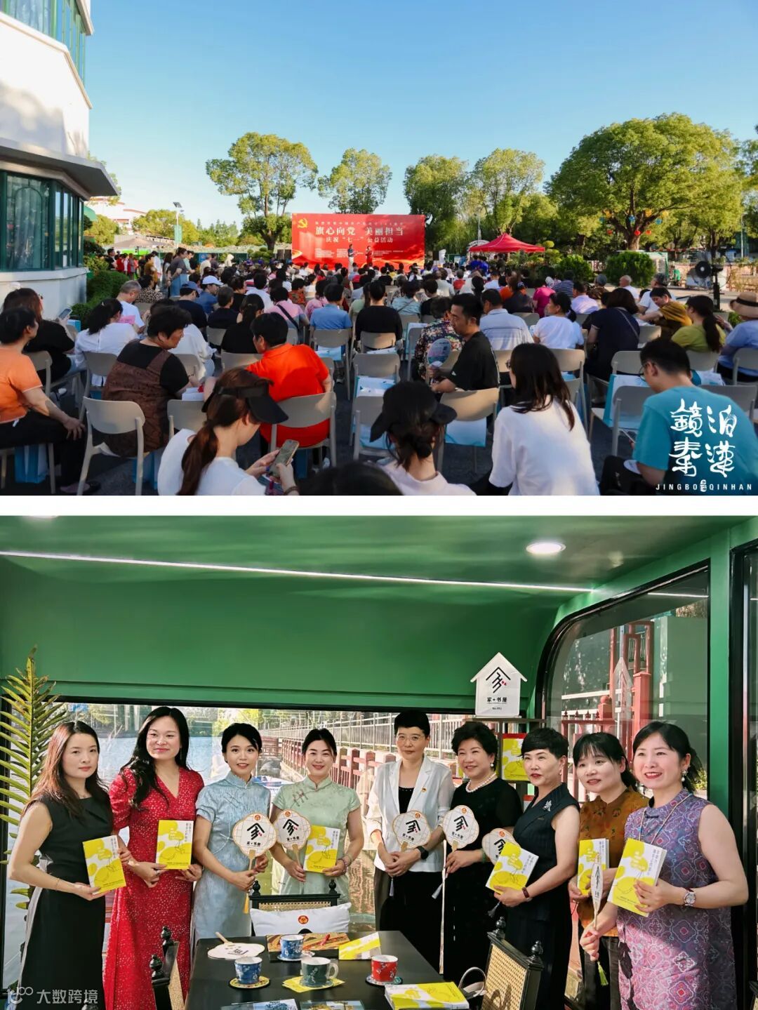 随着交流会告一段落,活动转入庆祝中国共产党成立104周年公益活动环节,现场汇聚数百人,气氛热烈。童小言带着新书再次登台,与主持人镜泊秦汉“家+书屋”主理人李晚婷展开深度互动。当被问及书中青浦篇章,回忆起记忆中的青浦时,小言答道:“青浦是滋养我的沃土,尚美中学,青浦高级中学,我的求学时光都在这里度过,去年还荣幸回母校青浦高级中学在国旗下讲话。这里的江南水乡韵味,都是刻在骨子里的文化底蕴。这片水土教会我沉静,也给了我向前的底气。”