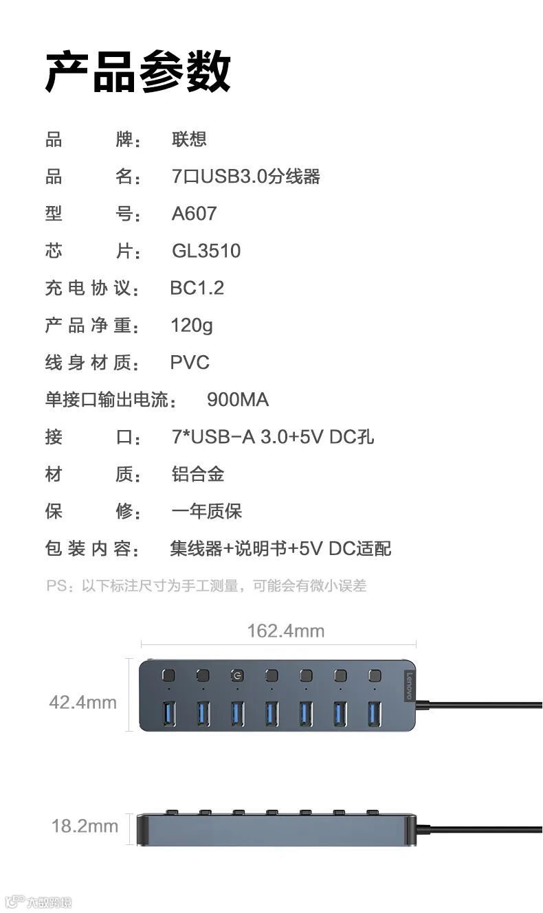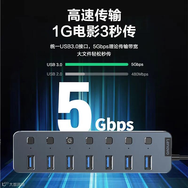 导读:联想 USB3.0分线器 七合一HUB铝合金高速7口扩展坞笔记本台式外接延长线 A607(7口HUB)