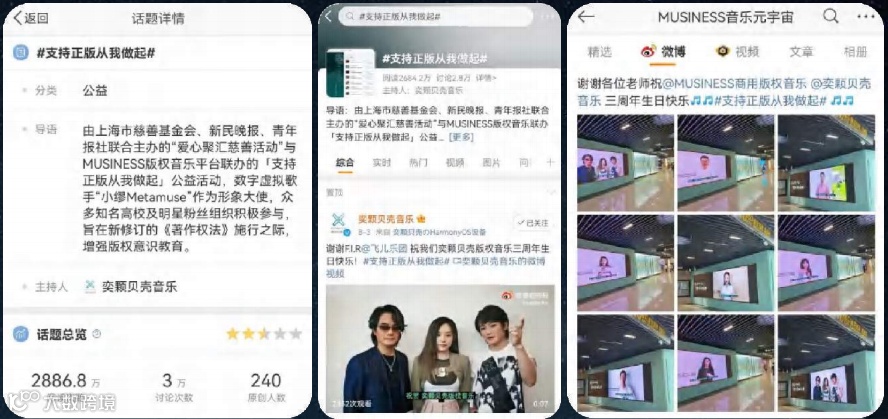 「支持正版从我做起」公益活动在全网上产生了3000余万阅读及3万+讨论,吸引了众多高校、企业、演艺人及粉丝参与支持。艺人作为版权使用者或拥有者,通过参与公益活动,体验正版音乐授权流程,普及正版观念,宣传版权保护意识,激发优秀创作,同时起到正能量的榜样作用;粉丝的加入扩大了普及群体,在年轻人中起到了良好的宣传作用。