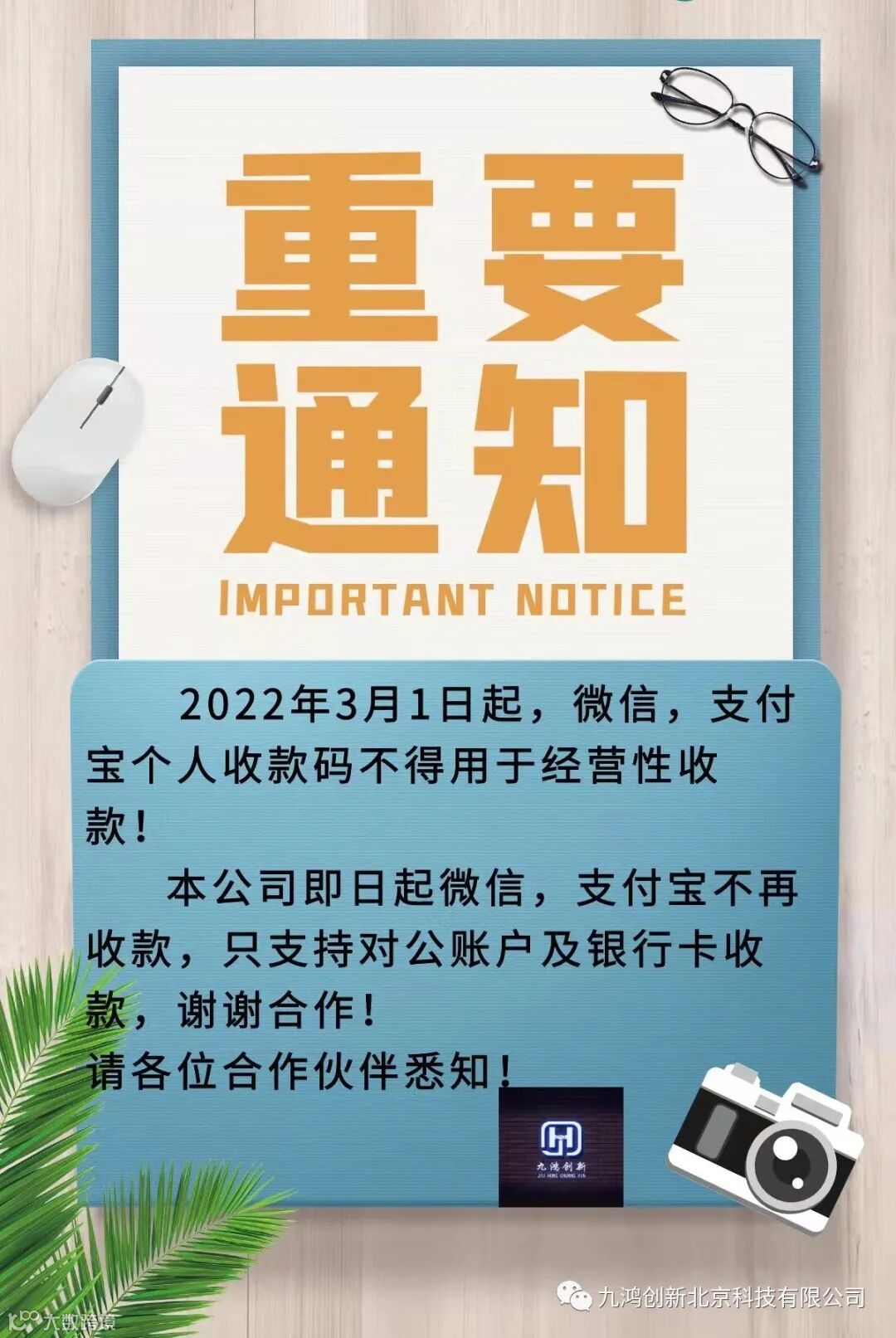本公司即日起微信,支付宝不再收款,只支持对公账户及银行卡收