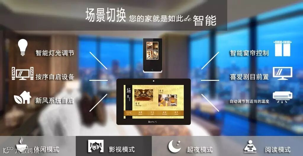 1.小的方面,离开家之前,睡觉之前一键关闭家里的灯光、窗帘、空调、地暖、多媒体等系统,同时报警系统开始进入警戒防范状态,这叫“一键场景”;这个功能很实用,再如您客厅繁多的遥控器,如果能变成一个遥控器,甚至用你的智能手机或平板电脑直接操控,那应该多方便呀,这叫“集中控制”;还有比如在回家之前开个空调之类的,叫做“远程控制”;甚至设定早晨6点放点音乐、开启窗帘,下午4点自动打开空调、热水等,这叫做“日程控制” ;更高级一些的,用户能跟家电设备用语言沟通,让它干嘛就干嘛,实现“语音控制”和“人工智能”。