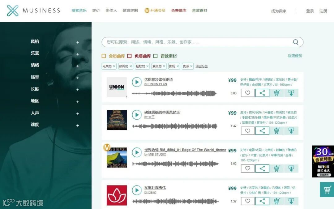 MUSINESS音乐素材网(www.musiness.vip),聚合了约300,000首优质大牌音乐、配乐、音效曲库及配音cv声展区,含数百位好莱坞音乐制作人作品,是世界经典名曲《班得瑞》全部15张专辑在中国大陆地区的独家授权代理。广告配乐、短视频背景音乐、元宇宙空间环境音乐、影视配乐、游戏BGM、动漫BGM等需求均可在MUSINESS音乐素材网中依据标签和关键词搜索下载,并获得音乐授权使用证书。MUSINESS音乐素材网开放了部分免费音乐曲库,让用户尽情享受正版音乐商用的自由。2022年度广告门指数代理公司年度TOP100、设计制作代理公司TOP10、蝉联2022及2023年度中国国际广告节-广告主金伙伴百强企业。