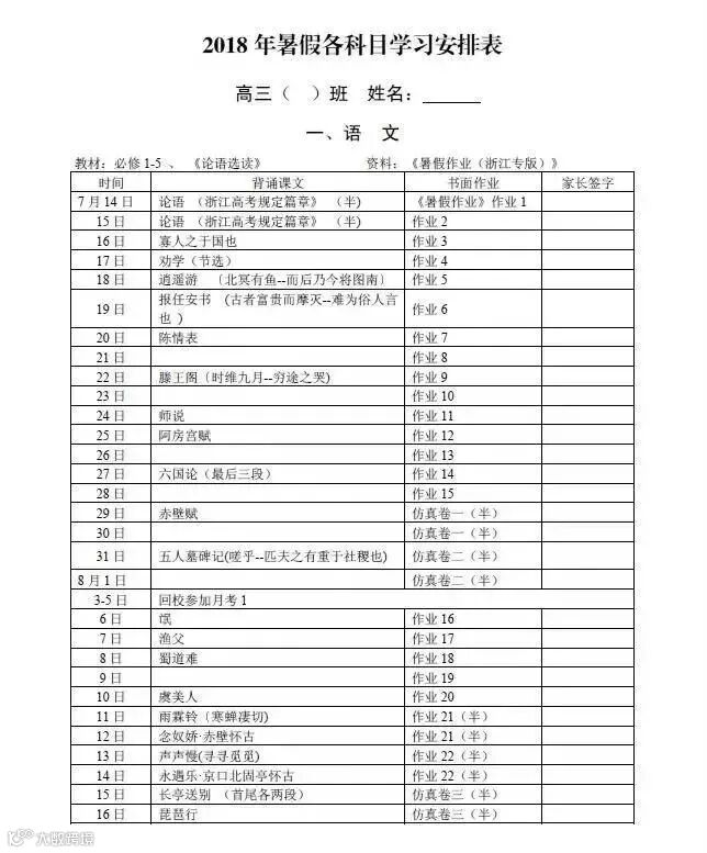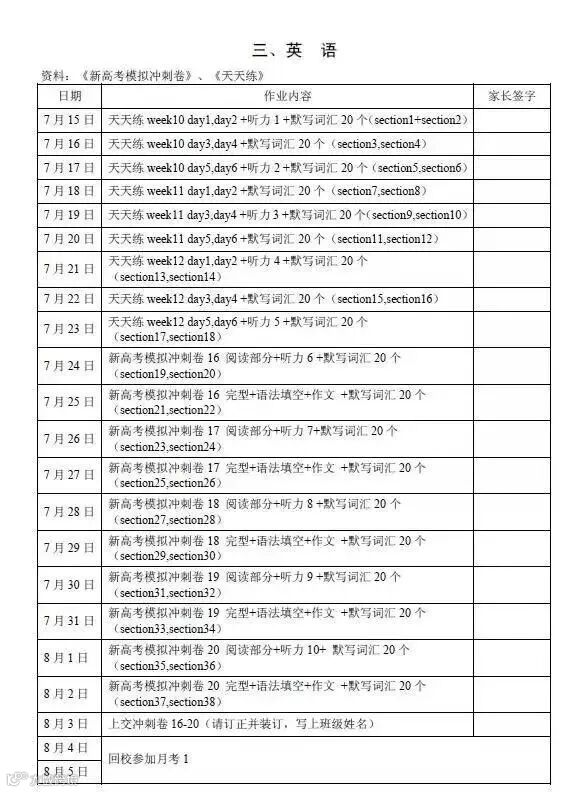 来看看杭州一所高中高三年级组的暑假作业节选: