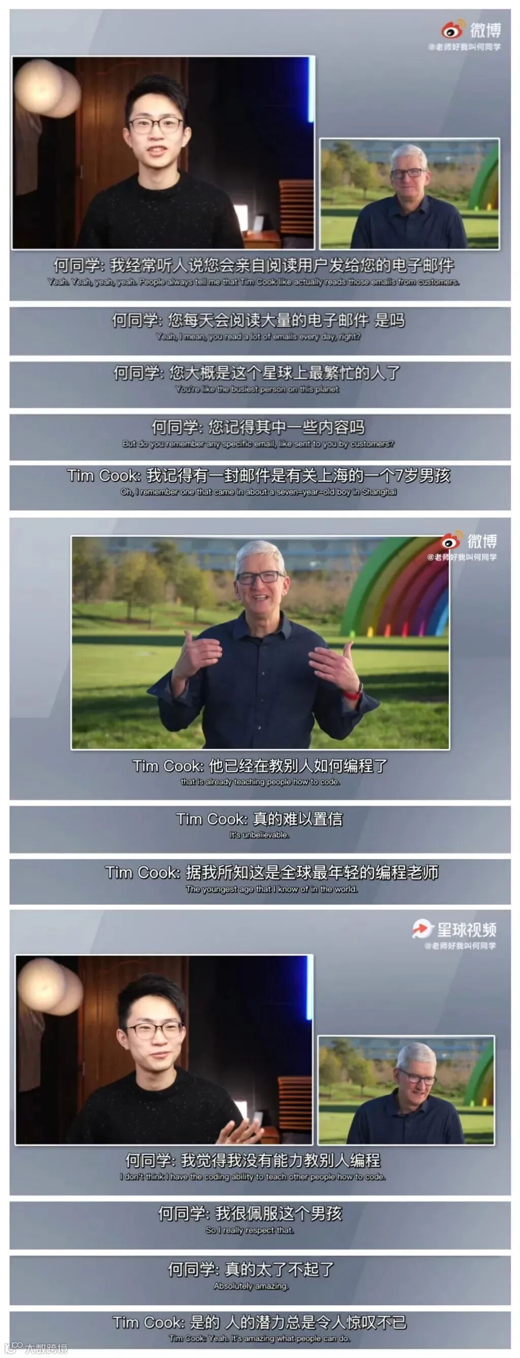 2月18日,知名视频创作者“老师好我叫何同学”上传了采访苹果公司CEO蒂姆·库克的视频,引发强烈的关注。库克在采访中提到了令他印象深刻的上海男孩:年仅7岁的编程老师。