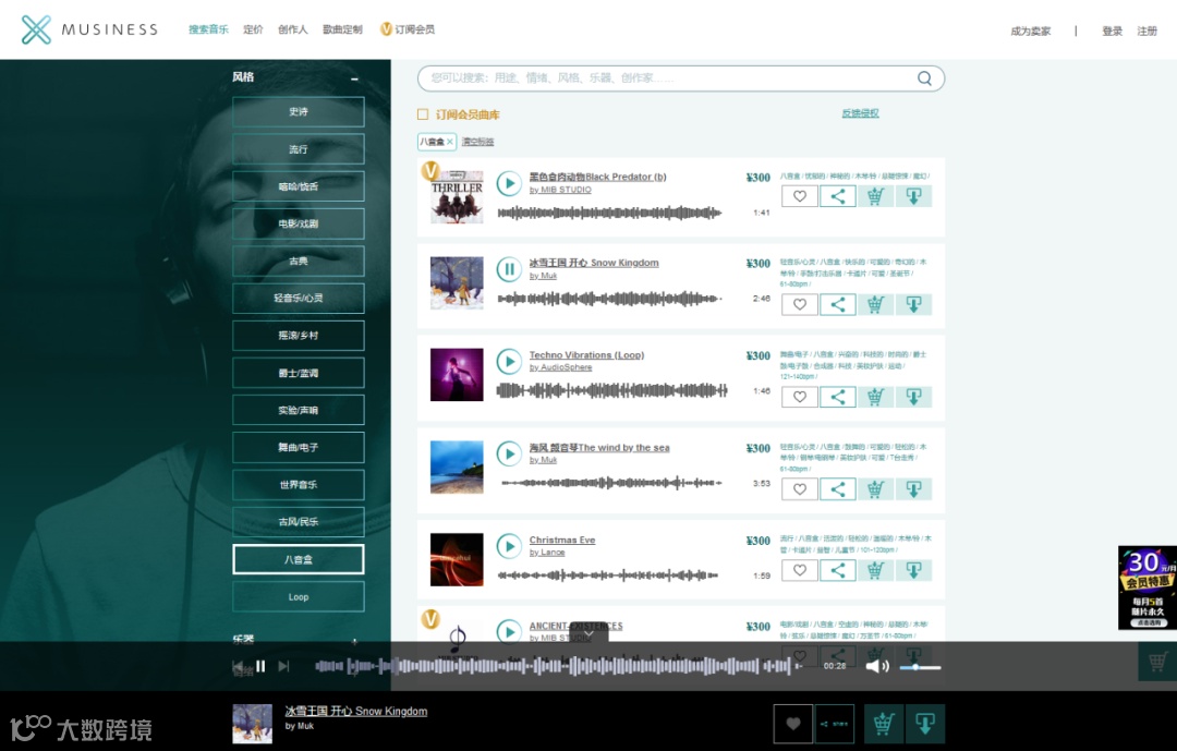 MUSINESS音乐素材网(www.musiness.vip),聚合了约300,000首优质大牌音乐、配乐、音效曲库及配音cv声展区,含数百位好莱坞音乐制作人作品,是世界经典名曲《班得瑞》全部15张专辑在中国大陆地区的独家授权代理。广告配乐、短视频背景音乐、元宇宙空间环境音乐、影视配乐、游戏BGM、动漫BGM等需求均可在MUSINESS音乐素材网中依据标签和关键词搜索下载,并获得音乐授权使用证书。MUSINESS音乐素材网还开放了部分免费音乐曲库,让用户尽情享受正版音乐商用的自由。