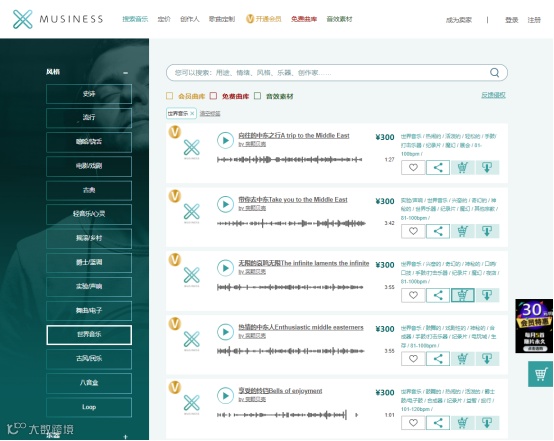 MUSINESS版权音乐平台(www.musiness.vip),聚合了约300,000首优质大牌音乐、配乐、音效曲库及配音cv声展区,含数百位好莱坞音乐制作人作品,是世界经典名曲《班得瑞》全部15张专辑在中国大陆地区的独家授权代理。广告配乐、短视频背景音乐、元宇宙空间环境音乐、影视配乐、游戏BGM、动漫BGM等需求均可在MUSINESS曲库中依据标签和关键词搜索下载,并获得音乐授权使用证书。MUSINESS还开放了部分免费音乐曲库,让用户尽情享受正版音乐商用的自由。