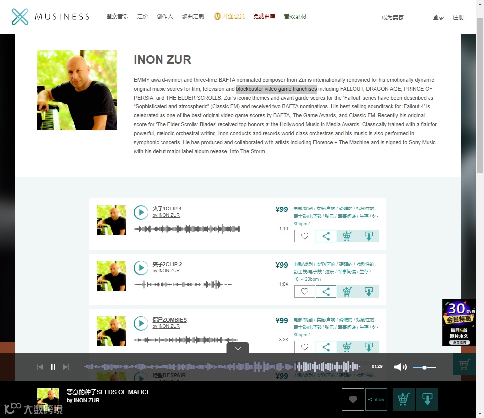 MUSINESS音乐素材网(www.musiness.vip),聚合了约300,000首优质大牌音乐、配乐、音效曲库及配音cv声展区,含数百位好莱坞音乐制作人作品,是世界经典名曲《班得瑞》全部15张专辑在中国大陆地区的独家授权代理。广告配乐、短视频背景音乐、元宇宙空间环境音乐、影视配乐、游戏BGM、动漫BGM等需求均可在MUSINESS音乐素材网中依据标签和关键词搜索下载,并获得音乐授权使用证书。MUSINESS音乐素材网还开放了部分免费音乐曲库,让用户尽情享受正版音乐商用的自由。
