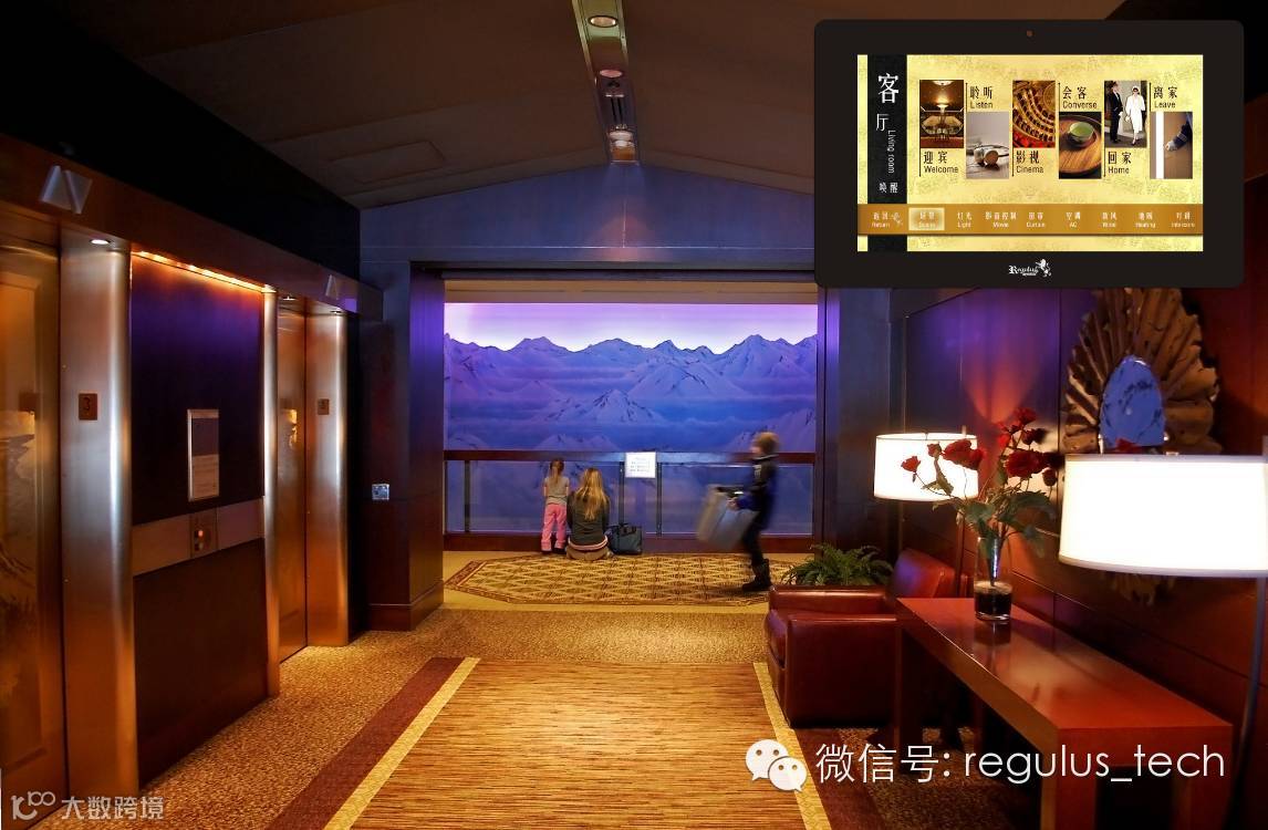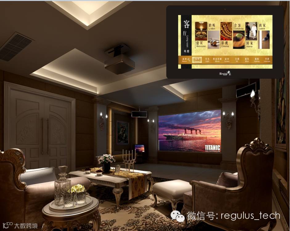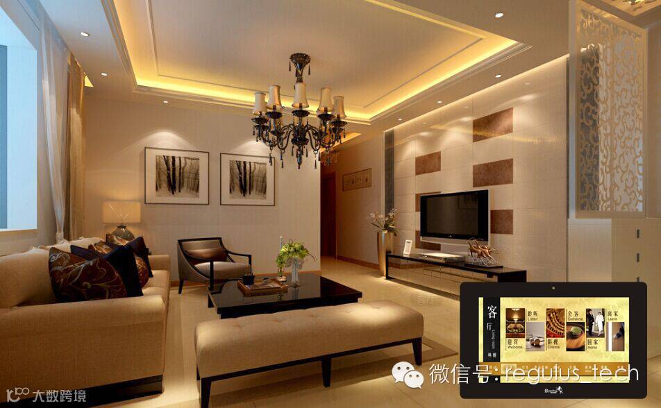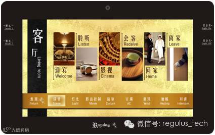 您只需轻触一下数字智能终端上的“迎宾”模式,这时,客厅灯光开启,窗帘缓缓升高,悠扬美妙的音乐声在耳边响起。营造一个属于你们的热情温馨场景。