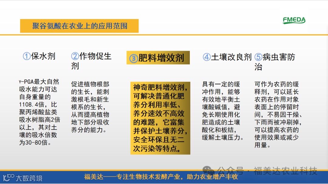 聚谷氨酸(γ-PGA)在农业中因其独特的生物可降解性、吸附性、保水性和环境友好性,被广泛应用于提升作物产量、改善土壤质量及减少环境污染。
