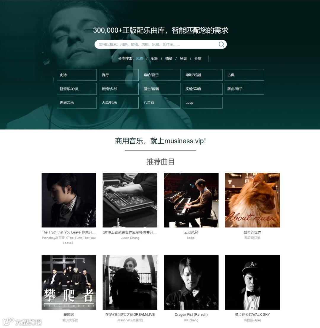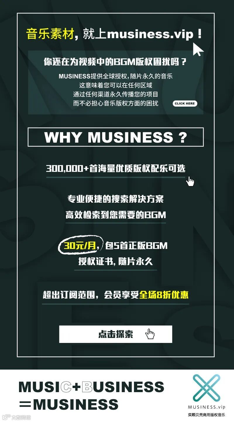 MUSINESS商用版权音乐平台www.musiness.vip,专注版权音乐、商用音乐的授权与交易,营造中国良好的商用音乐版权意识及交易环境。聚合了300000首大牌音乐、配乐、音效曲库。