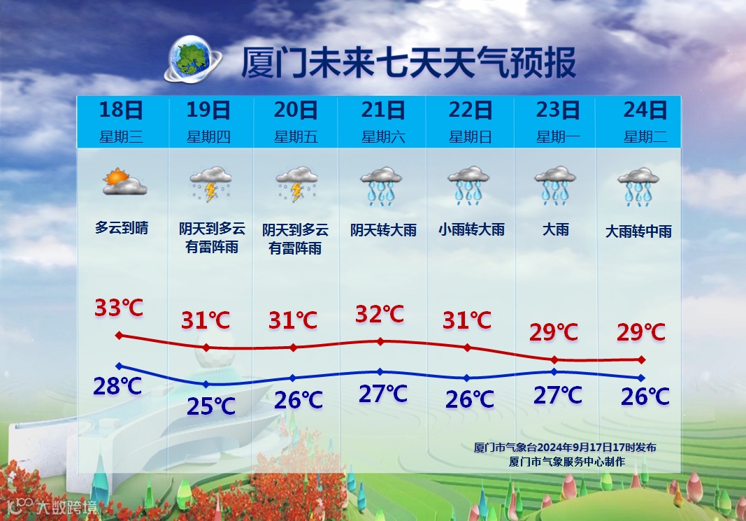 在雨水的影响下,19~20日,市区最高气温将降至31℃左右。总体来说,未来厦门天气多变化,海上低值系统活跃,大家注意及时关注最新天气预报预警信息,做好相关防范。