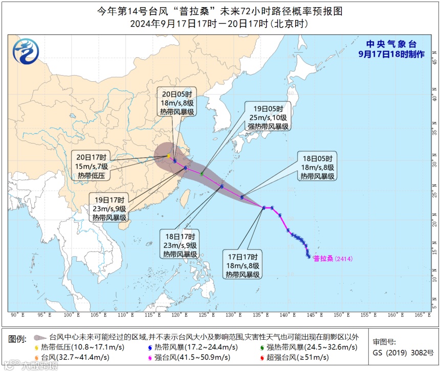 今年第14号台风“普拉桑”(热带风暴级)的中心于17日17时位于距离琉球群岛那霸市东偏南方向约920公里的洋面上,就是北纬22.1度、东经135.5度,中心附近最大风力8级(18米/秒),中心最低气压998百帕,七级风圈半径180-260公里。