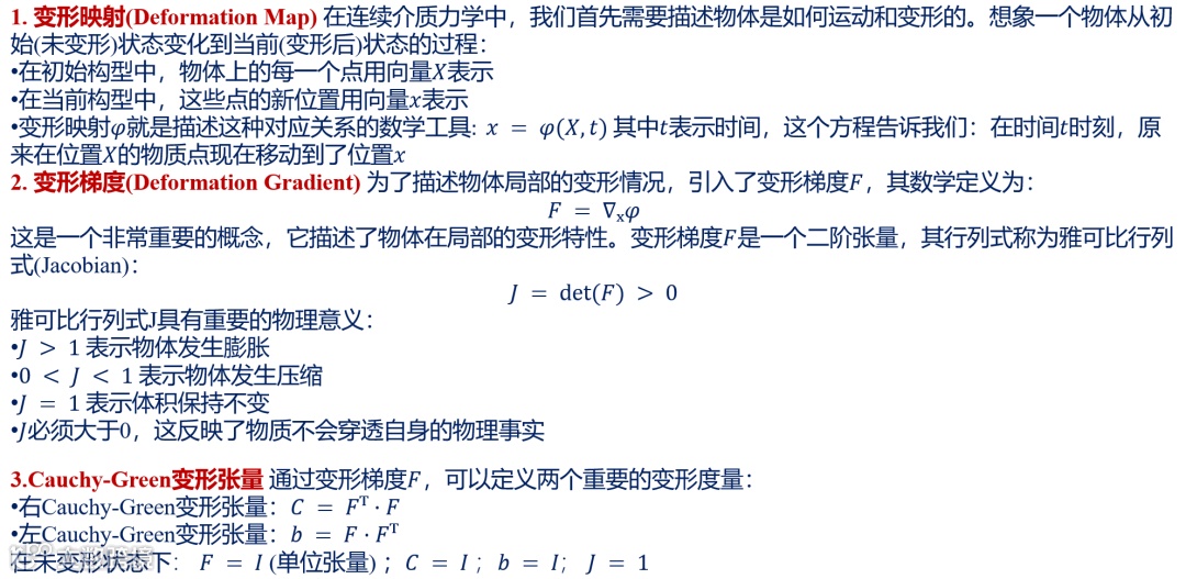• 连续介质力学回顾: 系统性复习变形梯度、Cauchy-Green张量、材料各向同性、不可压缩性等核心力学概念,为后续建模奠定理论基础。 -