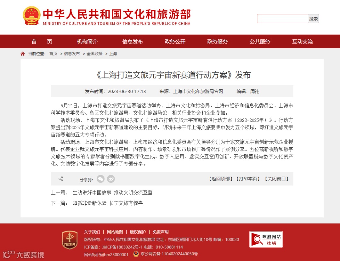 6月21日,上海市打造文旅元宇宙赛道活动举办。上海市文化和旅游局、上海市经济和信息化委员会、上海市科学技术委员会、各区文化和旅游局、文化和旅游场馆、相关行业协会和企业参加。