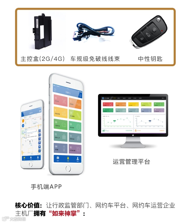 他是一个套装,严格说是一个车联网方案:汽车智能电子+阿里云端+软件管理端,硬件首先安装在汽车内,软件管理端在网约车公司,通过阿里云连接。网约车公司在办公室,可以做到随时远程控车:对于运营公共安全有风险、出现多次违章不及时处理、逾期不还款的车辆,进行远程钥匙禁用,车辆无法启动,车主正常后,远程禁用解除,车辆正常使用。更加特色的是;恶意拆除设备后仍然无法启动车辆;不光解决了大家关注的痛点问题还直接的推动了网约车企业快速走向普及和成熟。