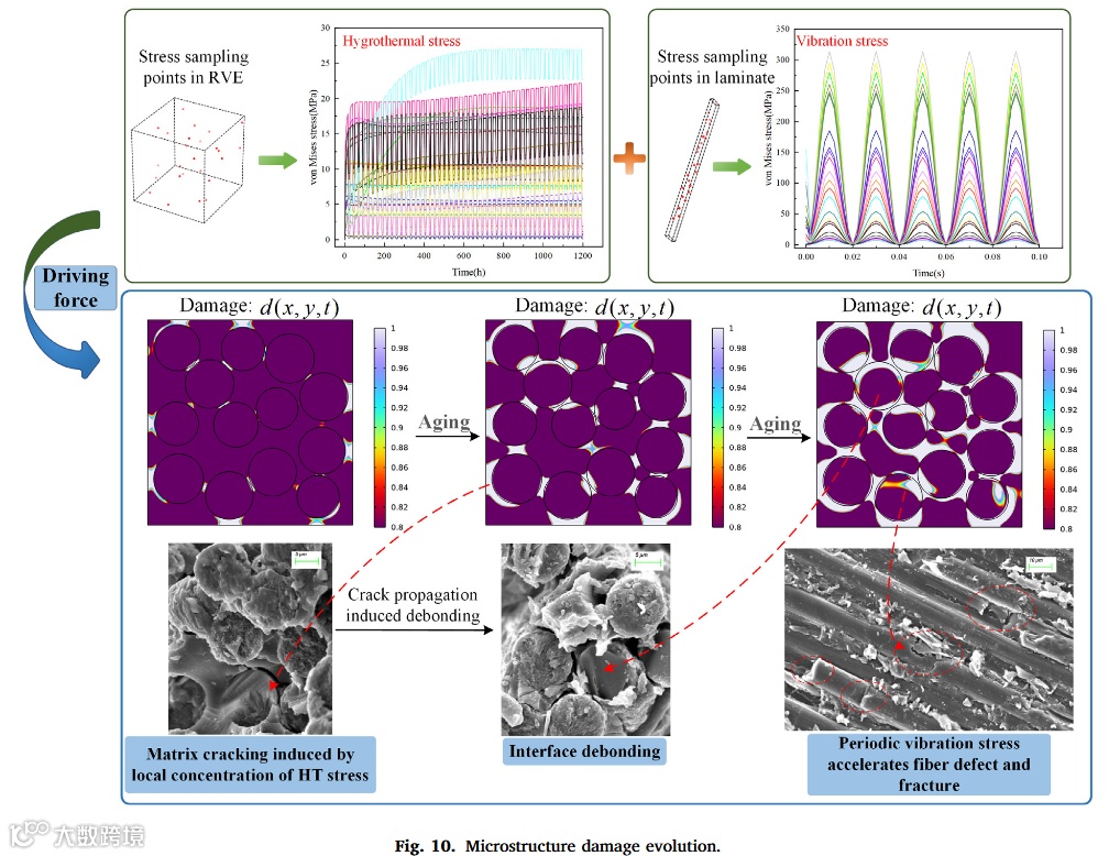 2. 多尺度FEM结合相场法成功模拟基体开裂/纤维脱粘,电阻监测与SEM验证振动引发纤维损伤; -