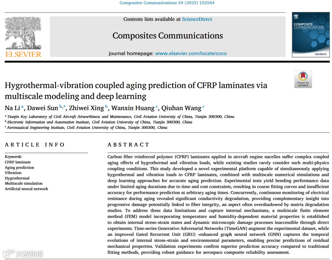 这篇论文发现了一个关于航空发动机舱CFRP层合板在真实服役环境中加速老化的真问题。该问题的核心硬挑战在于实验难以模拟湿-热-振多物理场耦合效应,且长期老化数据匮乏。为了攻克这一挑战,作者提出了融合多尺度FEM、相场损伤模型与GRU-GNN深度学习的巧方法。该方法取得了预测精度较传统方法提升30% 的强效果,最终为我们带来了 “振动通过应力幅值主导纤维损伤,电阻变化可定量表征损伤方向性” 的 新见解。