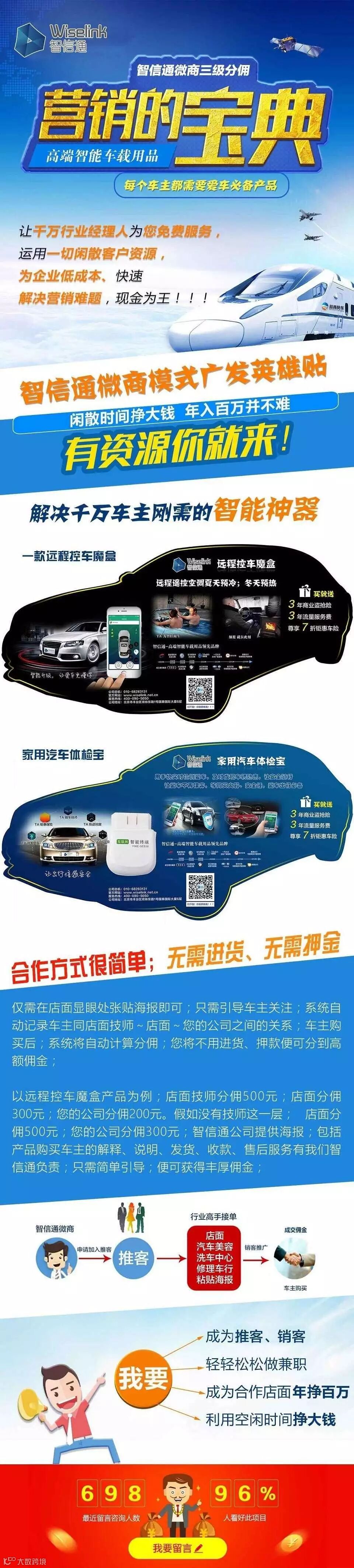 智信通汽车金融科技一系列好产品推荐给您;一款远程空调魔盒(手机远程启动;夏天制冷、冬天制热、功能强大)合作方式很简单;无需进货、无需押金;仅需在店面显眼处张贴海报即可;海报上有我们的微商城二维码;只需引导车主关注;系统自动记录车主同店面技师~店面~您的公司之间的关系;车主购买后;系统将自动计算分佣;您将不用进货便可分到高额佣金。