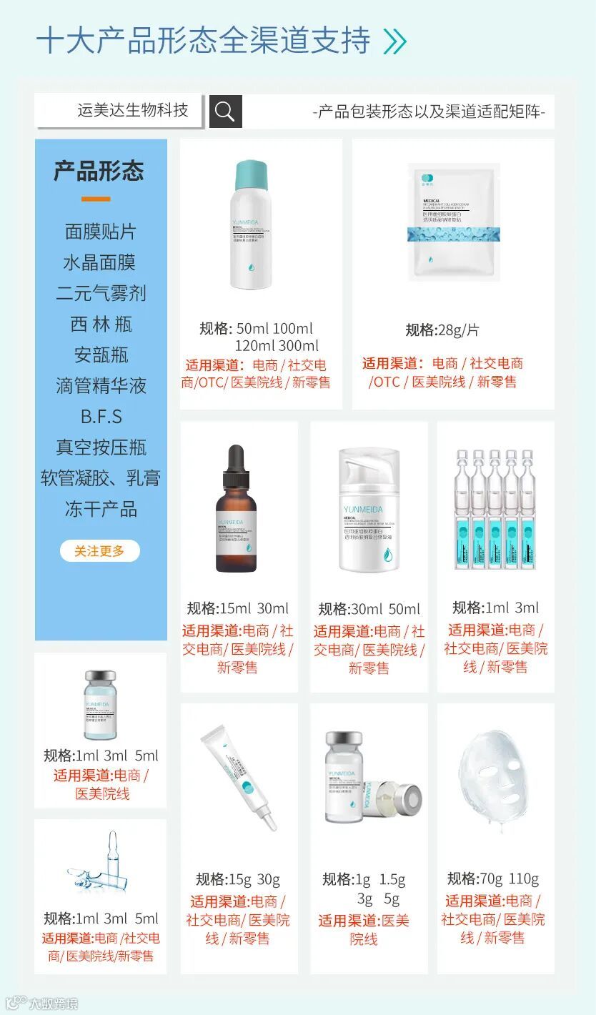 依托25张注册证和运美达优质产能条件,我司可生产十大品类:面膜、水晶面膜、西林瓶、安瓿瓶、二元气雾、滴管精华、软管、真空按压瓶、BFS、冻干品。其中医美面膜产能行业领先。