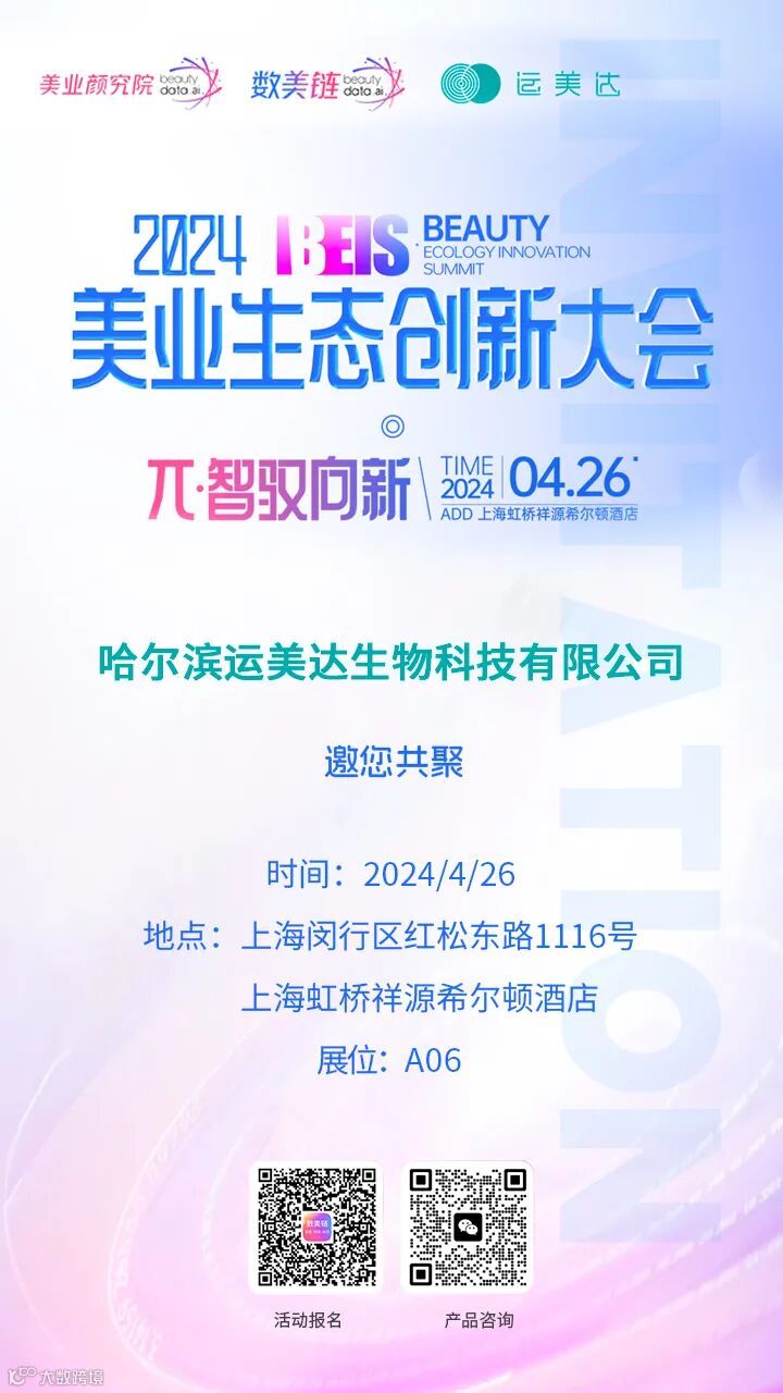 4月26日,由美业颜究院&数美链举办的2024“美业生态创新大会”将在上海虹桥祥源希尔顿酒店举办。运美达生物科技应邀参加本次展会,我们在上海虹桥祥源希尔顿酒店A06展位等您到来。