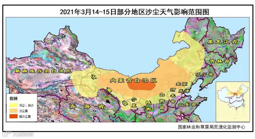 中央气象台发布沙尘暴黄色预警,受冷空气大风影响,预计15日08时至16日08时,新疆南疆盆地和东部、内蒙古、黑龙江西南部、吉林西部、辽宁西部、甘肃、宁夏、陕西北部、山西、河北、北京、天津等地的部分地区有扬沙或浮尘天气。其中,甘肃河西、河北中北部、北京等地的部分地区有沙尘暴,内蒙古西部、宁夏北部、陕西北部、山西北部等地局部有强沙尘暴。这是今春我国北方地区首次发生大范围沙尘暴天气。