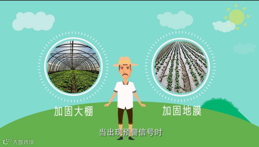 当出现预警信号时,农民应加固温室大棚、地膜等基础设施;正在田间劳作的农民应立即回家或寻找安全的地方躲避。