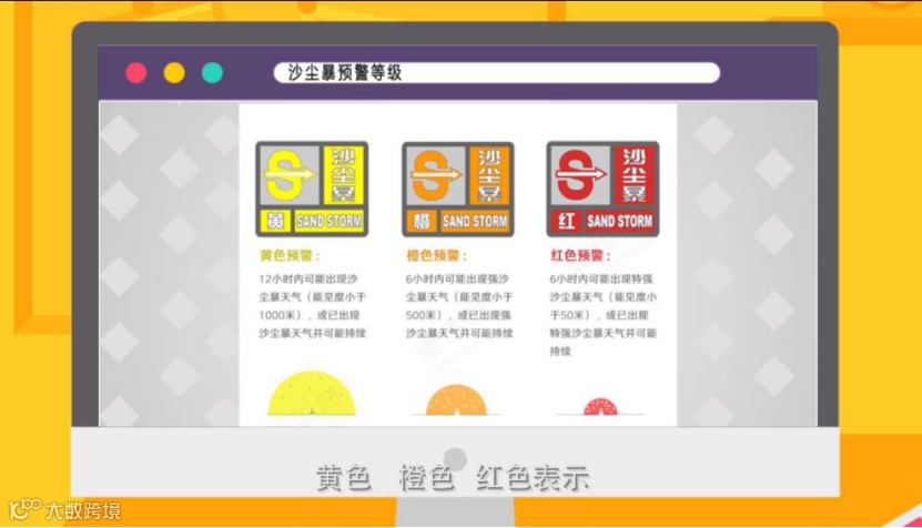 沙尘暴来临之前,气象部门会向社会发布预警信号,根据沙尘暴出现时间迟早和强度,沙尘暴预警可以分为三级,由弱到强,分别以黄色、橙色、红色表示。