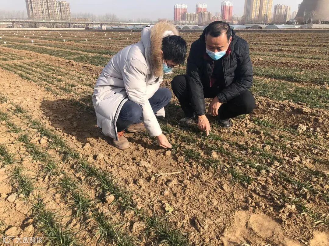 在山东省农科院小麦新品种试验田里,省农科院作物研究所研究员刘建军正在查看“济麦55”、“济麦0435”两个即将通过国家审定小麦新品种的苗情。虽然前期经历了低温寒潮,但是目前来看,两个新品种苗情耐寒抗冻,长势稳健。