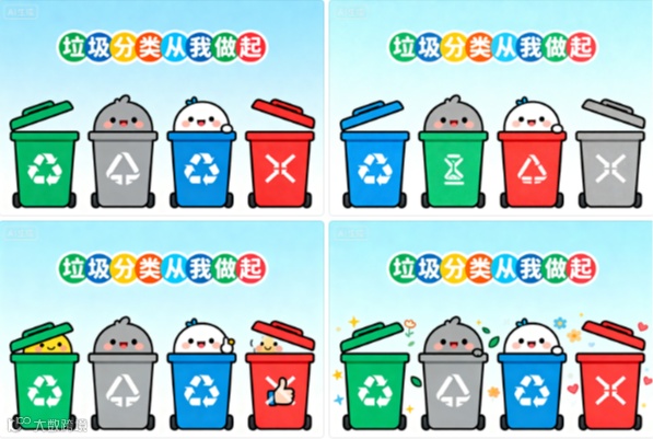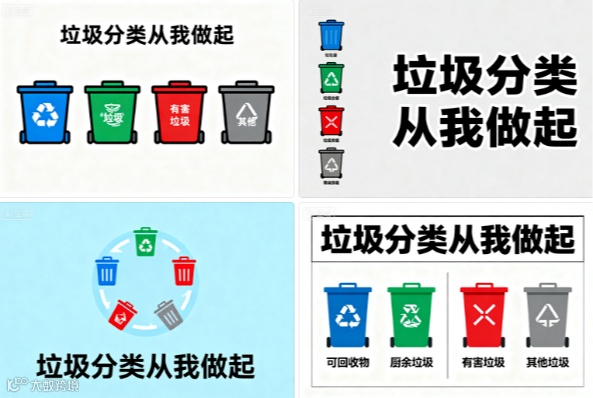 输入问题:通知类:“我要给社区垃圾分类宣传通知配图,风格简约清晰,有垃圾桶图标和‘垃圾分类从我做起’文字,适合打印张贴”。