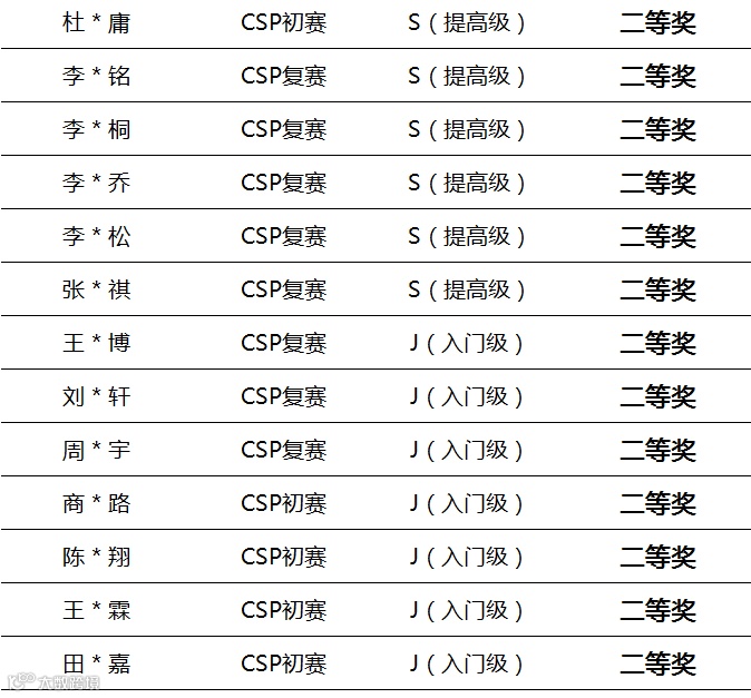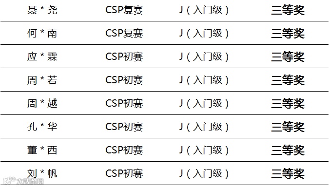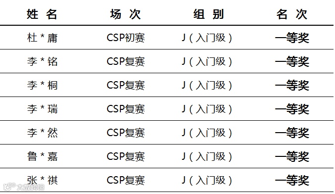 杜*庸、李*铭、张*祺、李*桐、李*瑞、李*然、鲁*嘉,6位科乐维学员,包揽2020 CSP-J(入门级)一等奖。