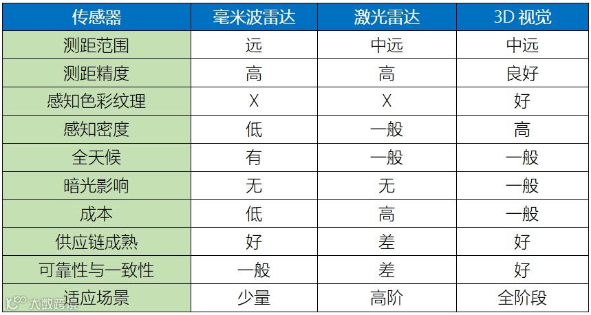 表 1 不同的传感器类型的技术对比