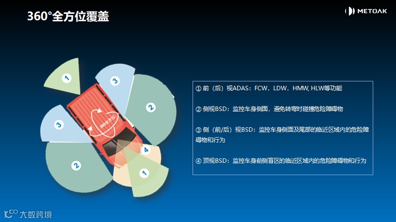 其包含商用车驾驶舱内/舱位两大功能。 舱内感知以DMS/OMS为主体, 实现驾驶员疲劳检测报警, 打电话/吃东西/左顾右盼等危险动作警示。