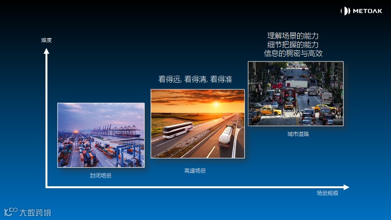 根据场景规模与技术难度, 大致可以划分为三大类场景: 低速封闭场景(低速, 封闭环境如港口,码头和矿区等), 高速城市干道场景(高速, 交通参与种类明显约束, 有较好的道路规则标识和边界等), 城区场景(中低速, 开放环境如城区物流配送, 最后一公里, 快递等, 交通参与者众多)。 低速封闭场景主要关注自动驾驶的准确性, 运营调度的高效性, 目前无人化的落地趋势最为明显。 高速城市干道环境主要关注识别距离远, 看的准确清晰和承受多种天气地理条件的影响。目前全球如图森未来、Waymo、小马智卡、嬴彻科技等均以推出量产卡车L4解决方案来推进落地。 而城区中低速场景则主要解决复杂参与者意图, 道路标记不清, 交通规则复杂等问题。比如商用车视野盲区问题, 城郊道路的限高/限宽可通过性, 路沿边界检测以及精准自动泊车等问题。