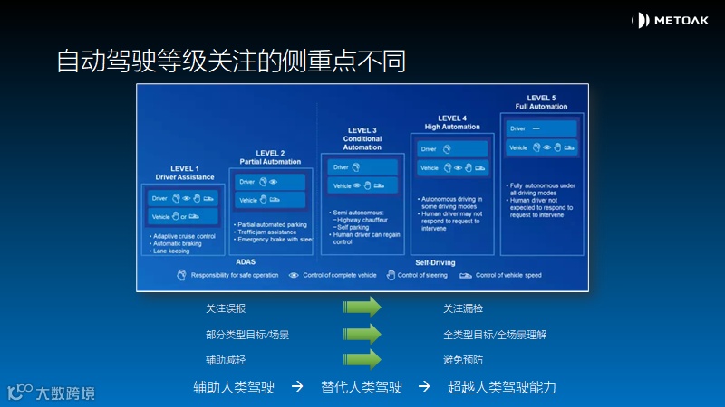 在自动驾驶的发展过程与逐步落地过程中, 自动驾驶技术不同的等级所关注的侧重点亦有所不同。 从辅助人类驾驶向替代人类驾驶以及超越人类驾驶能力的商业演变过程中, 我们逐渐从关注少误报(舒适性考虑)+少数种类目标和场景(技术成熟度和成本考虑)的辅助作用向少漏报(安全性考虑)+全类型目标和场景的预防避免和无人化作用演进。 如图表 5所示。