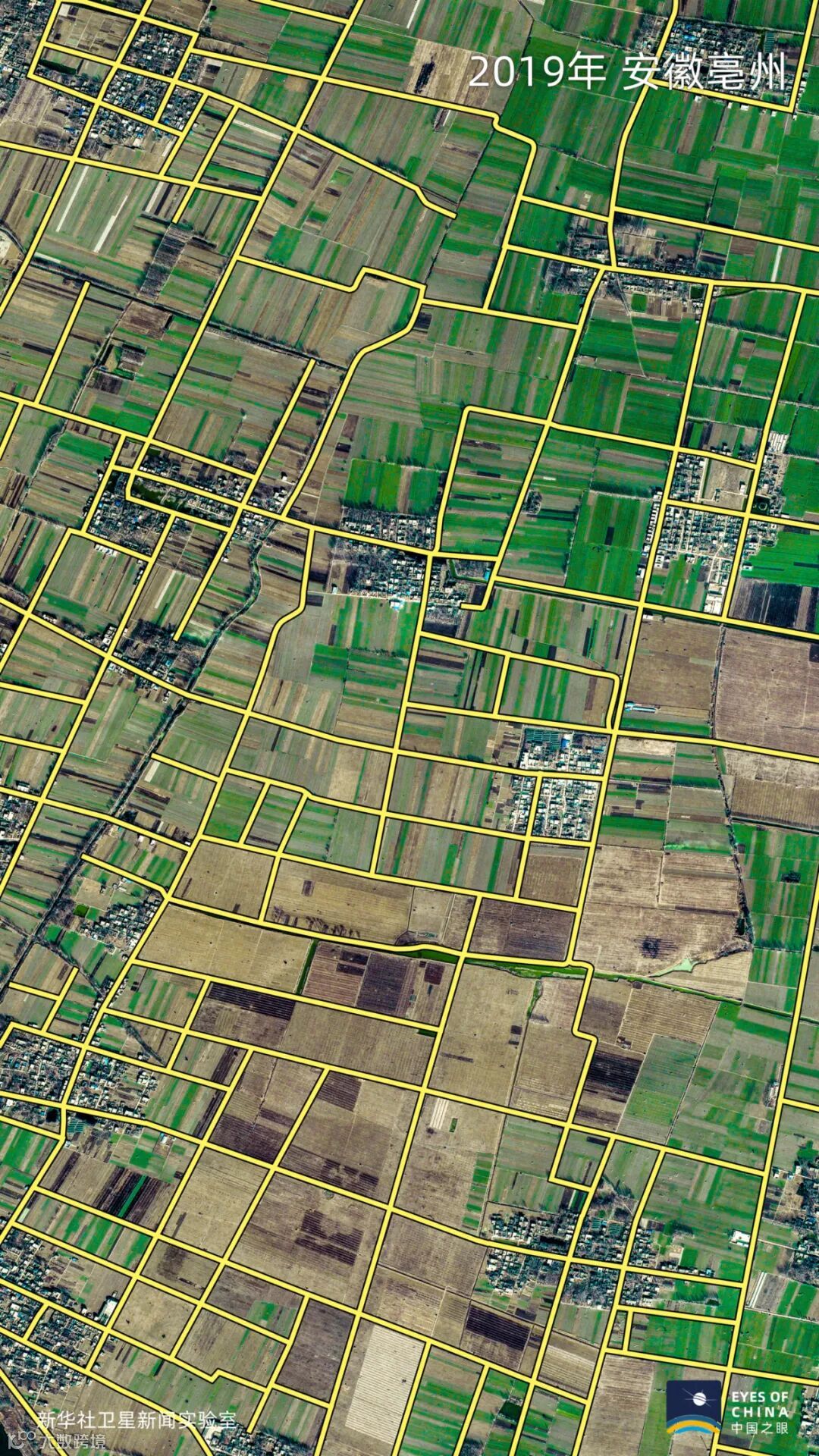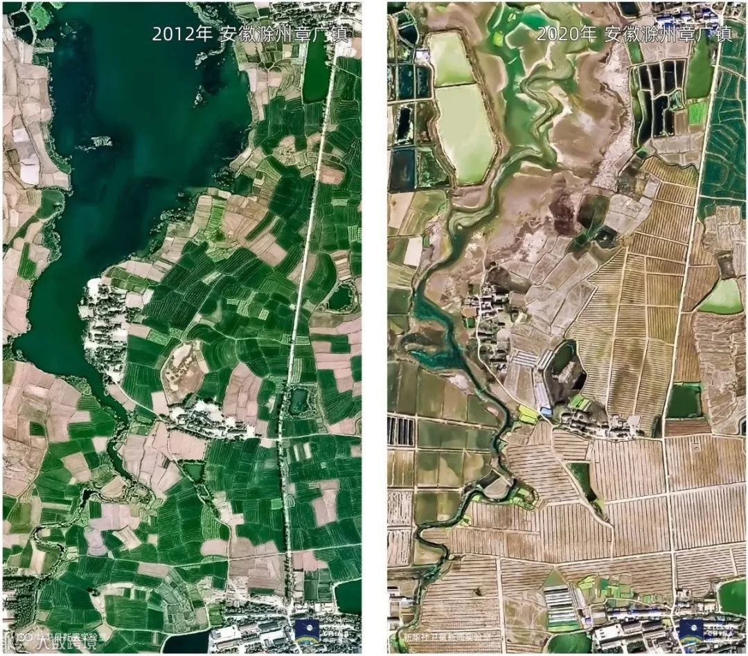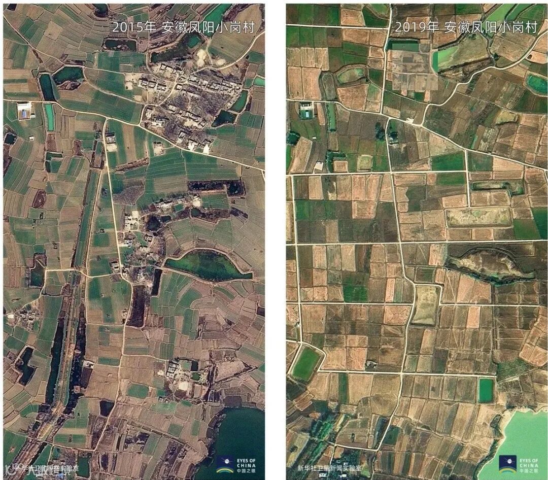 安徽凤阳小岗村,中国农村改革先行者,观察卫星影像发现,多年来不曾变化的田地,已经换了模样。