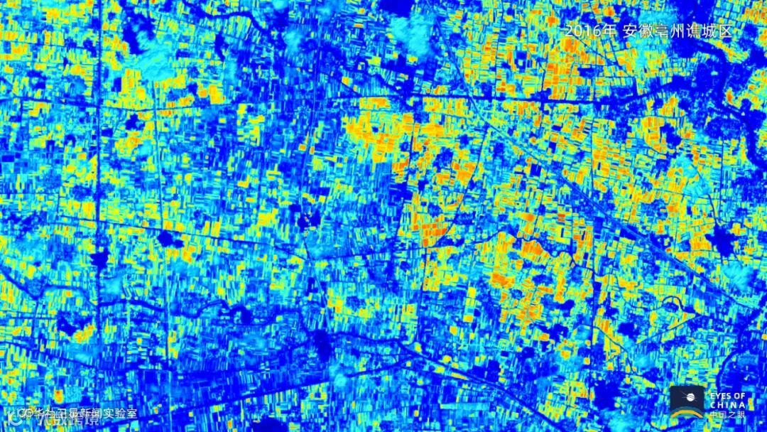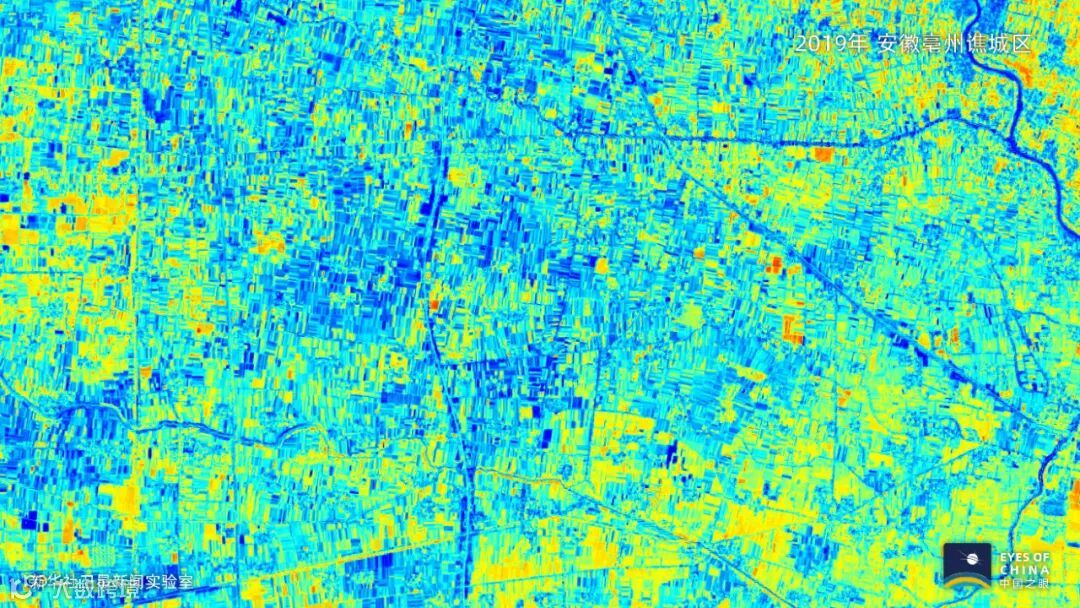 卫星观测作物叶冠含水量,可评价高标准农田的水利设施效果。蓝色和黄色分别代表含水量的高值和低值,一张图上的蓝色、黄色越深,则含水量差异越大。