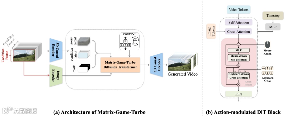 这种 “模拟 + 真实游戏场景” 的数据组合,既保证了数据的丰富性,又确保了交互逻辑的真实性 ——1200 小时的训练数据中,涵盖了从简单地形移动到复杂战斗场景的多样交互,让模型能应对不同场景的生成需求。模型架构上,其 “去文本分支” 的设计颇具颠覆性。基于 WanX 模型改造时,团队移除了文本处理分支,转而强化视觉与动作的关联:输入图像先经 3D Causal VAE 和 CLIP 图像编码器进行时空压缩,转化为视觉隐空间特征;用户的键盘、鼠标动作则通过动作注入模块处理 —— 连续鼠标操作经 MLP 层转化后,由时序自注意力层动态调整特征,键盘操作则通过交叉注意力层精准引导生成方向。