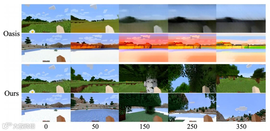 这种 “视觉 + 动作” 的双条件输入,让模型摆脱了语言先验的限制,更专注于空间结构与动态规律的学习。长视频生成的 “误差抑制” 机制则解决了行业痛点。通过 Self-Forcing 策略,模型将双向基础模型转化为自回归变体,每一帧的生成都基于前一帧的输出而非真实数据,从根本上减少了 “暴露偏差” 导致的误差累积。实验数据显示,相比 Oasis 模型,Matrix-Game 2.0 在连续生成 5 分钟视频后,场景一致性仍能保持 90% 以上,画面不会出现 “物体突然消失”“地形莫名变形” 等问题,这为其落地实用奠定了基础。