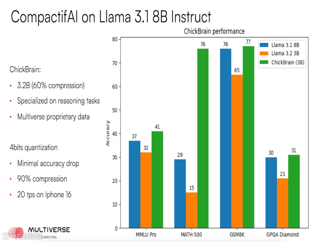 凭借 CompactifAI 技术,Multiverse 开始尝试对各类 AI 模型进行压缩。他们先是推出了 Llama 4 Scout、Mistral Small 3.1 等热门小型开源模型的压缩版,随后又将目光投向 OpenAI 的新开源模型,甚至对 DeepSeek R1 这类超大型模型也进行了精简,研发出 Slim 版本。这些被统一纳入 “模型动物园” 的成果,都有一个共同特点:以动物大脑尺寸为命名灵感,追求 “体积最小却性能最强”。比如基于 Meta Llama 3.1 8B 模型打造的 “鸡脑(ChickBrain)”,参数规模压缩至 32 亿,却小巧到能在 MacBook 上离线运行,在多项标准基准测试中表现甚至略优于原版;而以 Hugging Face SmolLM 2-135 为基础的 “超级苍蝇(SuperFly)”,参数从 1.35 亿缩减至 9400 万,奥鲁斯将其大小比作苍蝇的大脑,虽不涉及复杂推理需求,却能嵌入家用电器,支持用户通过语音指令完成 “启动快速洗涤” 这类操作,在演示中还展现出借助小型处理器实现语音交互的能力。