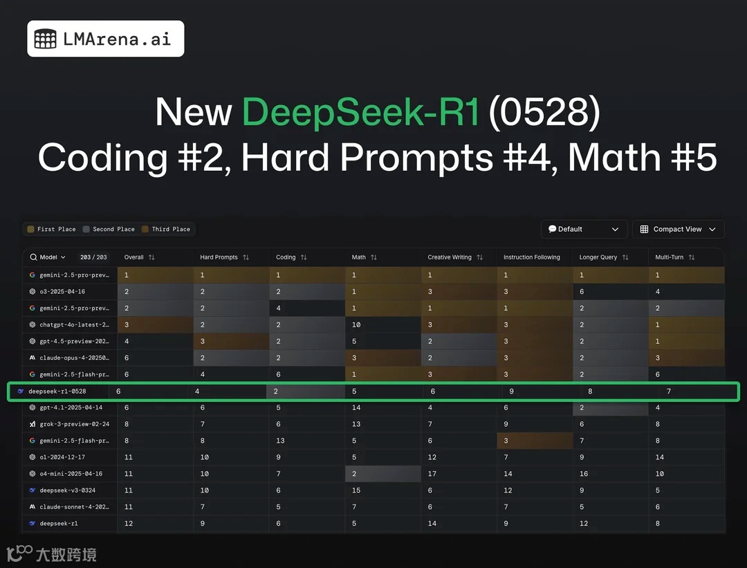在其他细分领域的测试中,DeepSeek-R1(0528)同样表现不俗。在硬提示词(Hard Prompt)测试中排名第 4,展现出对复杂提示信息的准确理解和处理能力;在编程(Coding)测试中排名第 2,再次证明了其在编码方面的卓越实力;在数学(Math)测试中排名第 5,说明它具备较强的数学推理和计算能力;在创意性写作(Creative Writing)测试中排名第 6,显示出在创意表达和文字创作方面的独特优势;在指令遵循(Intruction Fellowing)测试中排名第 9,表明能够较好地理解并按照用户指令执行任务;在更长查询(Longer Query)测试中排名第 8,体现了对长文本信息的有效处理和分析能力;在多轮(Multi-Turn)测试中排名第 7,反映出在多轮对话场景中的良好表现和适应性。