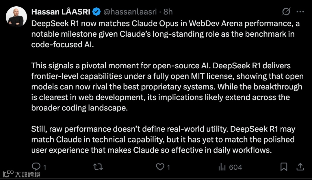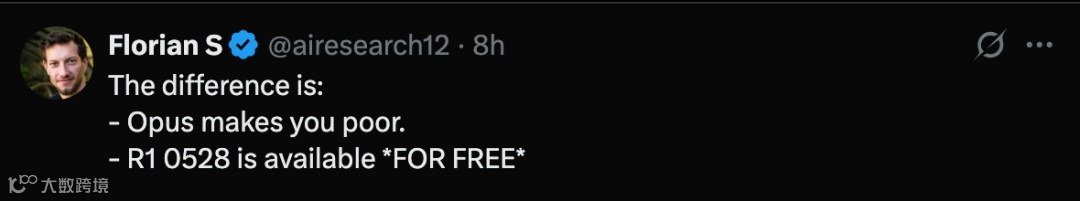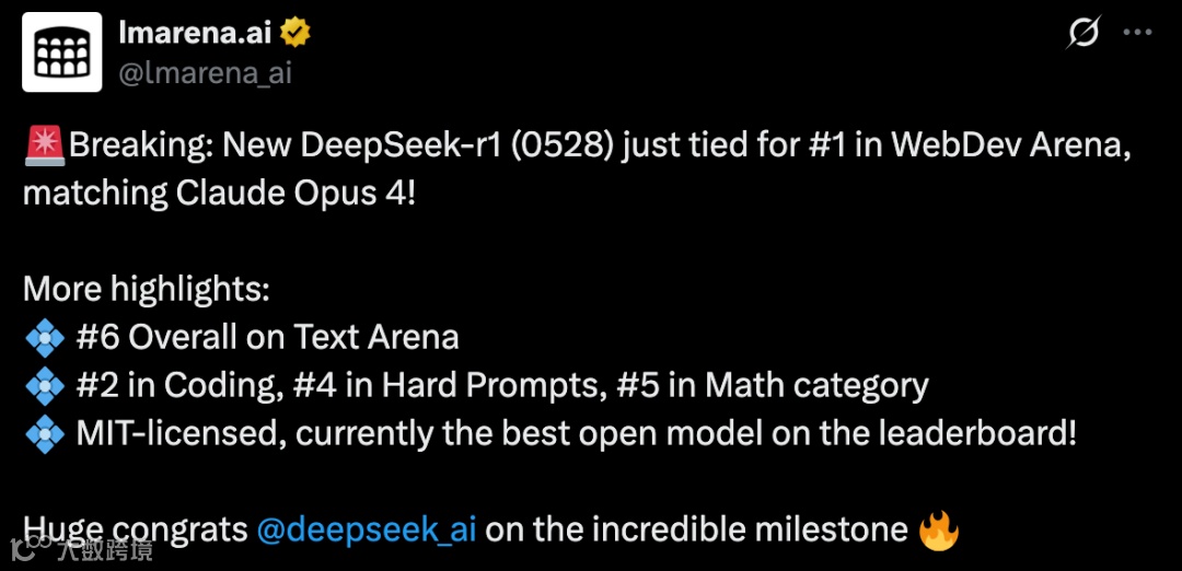 LMArena 最新测试结果一经公布,便在社交平台上引发了轩然大波。在 X 平台上,用户 Sughu 兴奋地表示:“DeepSeek 与 Claude Opus 4 匹敌。这些数字令人难以置信。” 从这句话中,我们可以感受到用户对 DeepSeek-R1(0528)表现的震惊与赞叹。还有许多用户已经迫不及待地想要亲自体验 R1(0528)的实际效果,他们摩拳擦掌,跃跃欲试,仿佛即将开启一场激动人心的冒险。甚至有用户拿 R1 的开源特性来调侃 Opus 等封闭模型:“区别在于:Opus 让你变穷,但 R1 是免费的。” 这句看似玩笑的话语,背后却反映出开源模型在成本方面的巨大优势,对于广大开发者和用户来说,免费且性能强大的开源模型无疑具有极大的吸引力。当然,也有一些用户保持着理性的态度,他们认为 DeepSeek R1 目前在测试中展现出的性能确实令人印象深刻,但在用户体验方面还有很大的提升空间,与 Claude 相比仍存在一定差距。例如,Claude 在界面设计、交互流程等方面可能更加简洁、流畅,能够让用户在使用过程中感受到更加舒适和便捷。
