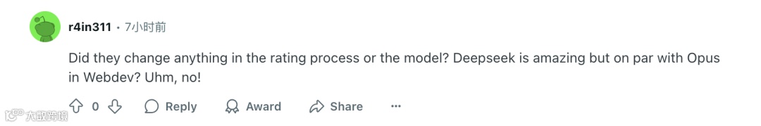 在 Reddit 平台上,同样掀起了一股关于 DeepSeek R1(0528)的讨论热潮。一些用户对其强大的编码能力赞不绝口,甚至断言使用 R1 辅助编程的开发者能够碾压使用其他封闭模型的开发者。有用户激动地表示:“DeepSeek R1(0528)很火。我知道这是 LMAarena 的测试(可能会有点不那么准确),但我绝对相信 R1 的实力有能力做到如此。我觉得它用在编程上,它的性能确实能与 Gemini/OpenAI 和 Anthropic 的模型匹敌。一个能用 DeepSeek 的程序员会碾压使用封闭模型的普通程序。” 然而,也有部分用户对 WebDev Arena 测试的结果表示怀疑。他们认为 DeepSeek 固然强大,但在 WebDev 领域中与 Opus 比肩,实在是让人难以相信。有用户质疑道:“他们(LMArena)有没有修改评级流程或模型?DeepSeek 很棒,但在 WebDev 领域能和 Opus 比肩吗?不可能的!”