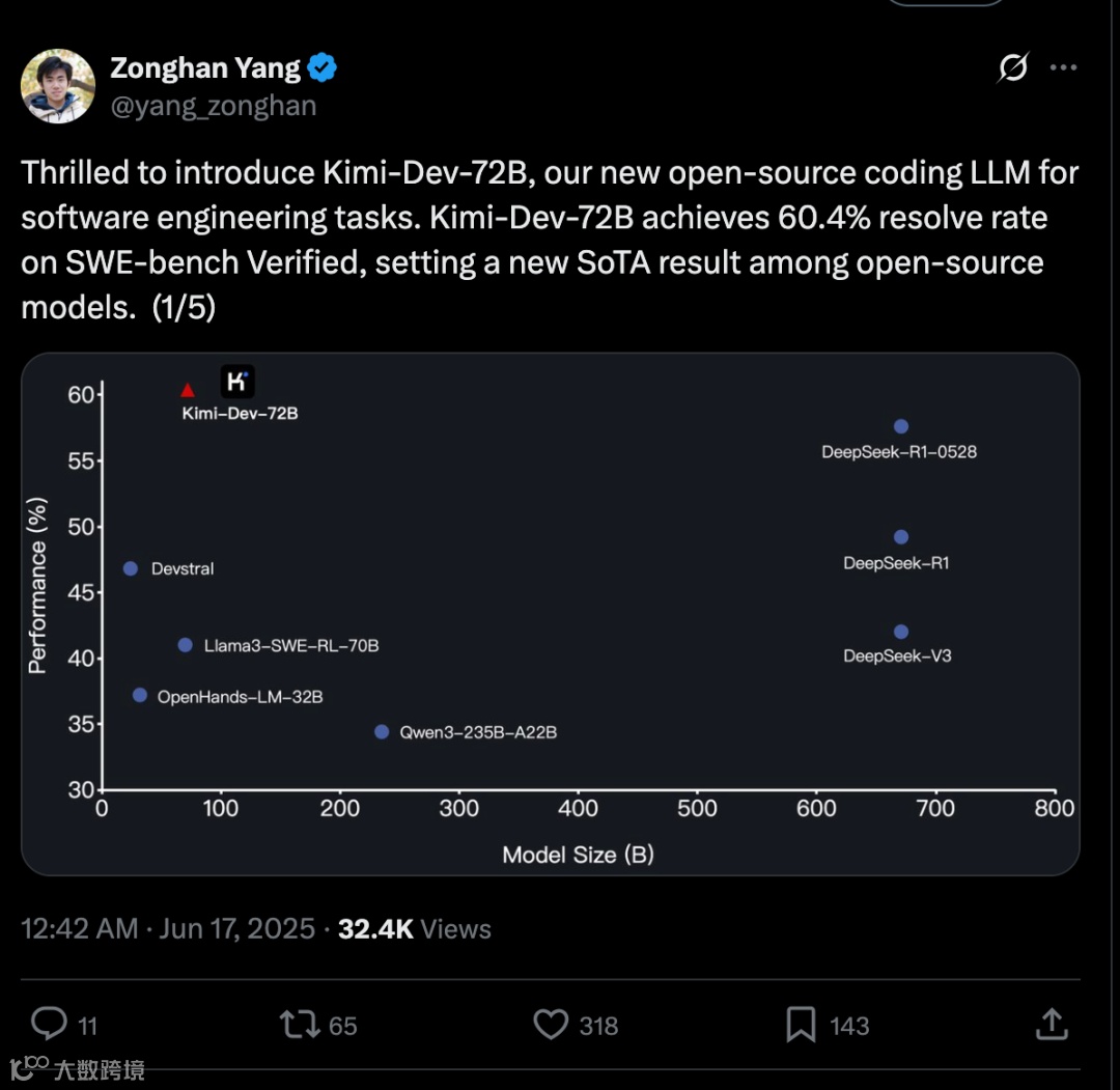 就在 DeepSeek R1(0528)引发广泛关注的同时,月之暗面也在悄然发力。巧合的是,近期月之暗面发布了针对软件工程任务的全新开源代码大模型 Kimi-Dev-72B,犹如一颗重磅炸弹,再次在 AI 领域掀起波澜。该模型的项目地址为https://huggingface.co/moonshotai/Kimi-Dev-72B ,在 SWE-bench Verified 编程基准测试中,Kimi-Dev-72B 取得了令人瞩目的成绩,达到了全球最高开源模型水平。令人惊讶的是,它仅以 72B 的参数量,成绩就超过了在 LMArena 编码能力测试中与谷歌、Anthropic 模型并列第一的 R1(0528)。在 AI 软件工程能力基准测试 SWE-bench Verified 上,Kimi-Dev-72B 更是斩获了 60.4% 的高分,成功创下开源模型的 SOTA 成绩。