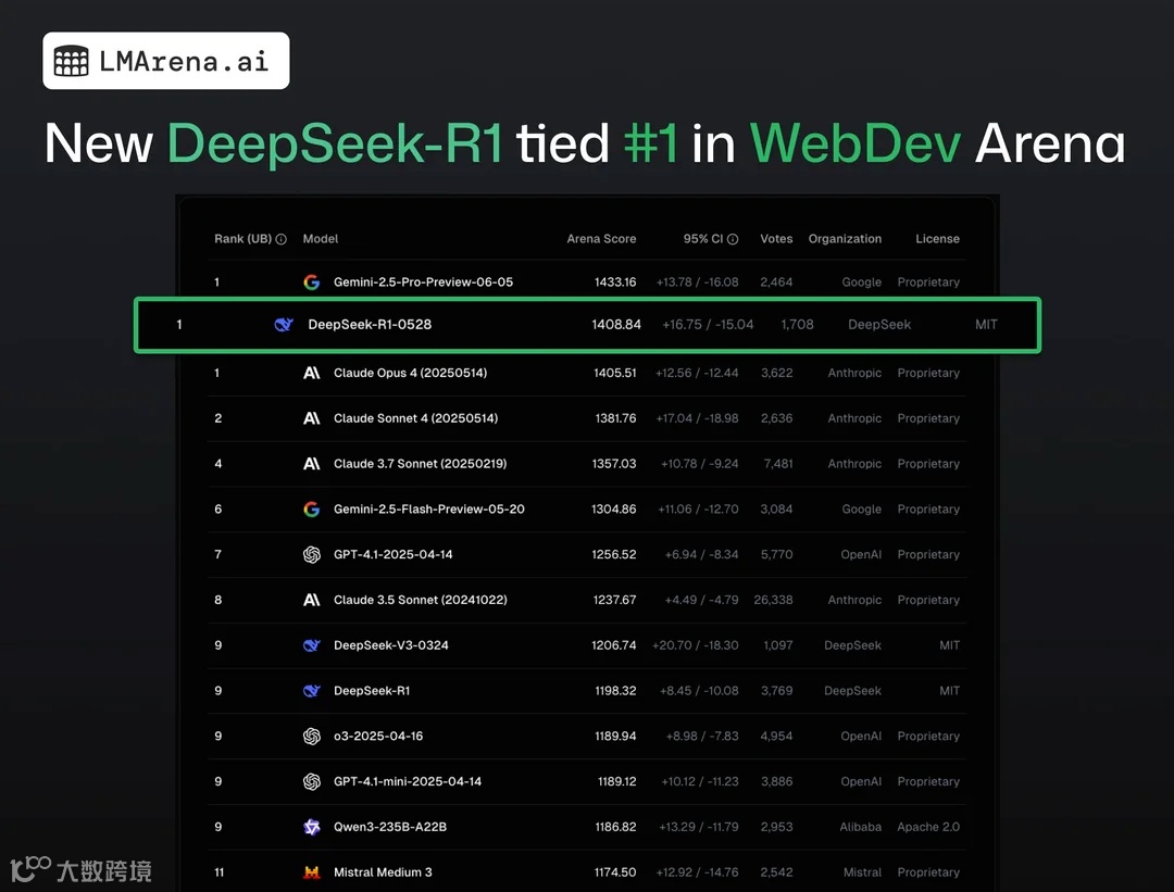 真正让开发者社区为之沸腾的,是 R1(0528)在大模型公共基准测试平台 LMArena 上的惊艳表现。它的性能排名如同火箭般蹿升,一举超越了多个顶尖封闭模型,成为了开源界的一颗璀璨新星。在 WebDev Arena 中,DeepSeek-R1(0528)的表现堪称卓越,与 Gemini-2.5-Pro-Preview-06-05、Claude Opus 4 (20250514) 等闭源大模型并列第一。更令人震惊的是,R1(0528)以 1408.84 分的高分,力压得分为 1405.51 的 Claude Opus 4,成功登顶。