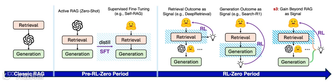 RAG 系统的发展可大致分为三个阶段。第一阶段是 Classic RAG,这一阶段使用固定 query、BM25 等 retriever(检索器),生成器对检索结果无反馈。模型只是简单地根据固定的检索策略获取信息,然后由生成器进行内容生成,缺乏对检索过程的优化与调整。第二阶段是 Pre-RL-Zero Active RAG,引入了多轮 query 更新,如 IRCoT、Self-RAG 等,部分通过 prompt 引导 LLM 检索新信息。其中,Self-RAG 进一步通过蒸馏大型模型的行为,训练小模型模拟多轮搜索行为,使得模型能够在一定程度上根据生成需求动态调整检索策略。第三阶段是 RL-Zero 阶段,强化学习开始用于驱动检索行为。代表方法如 DeepRetrieval,以 Recall、NDCG 等搜索指标为优化目标,专注于检索器本身的能力提升;Search-R1 则将检索与生成联合建模,以最终答案是否 Exact Match(精确匹配)作为强化信号,优化整合式的搜索 - 生成策略,尝试从整体上提升模型的性能。尽管 RL 方法在思路上更具主动性与交互性,为 RAG 系统的发展带来了新的活力,但在实际落地中仍面临诸多挑战,导致其优势未能充分发挥。