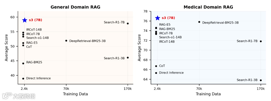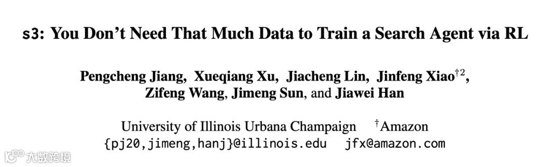 在此背景下,来自 UIUC & Amazon 的研究团队提出了 s3(Search-Select-Serve),这是一种训练效率极高、结构松耦合、生成效果导向的 RL(强化学习)范式。该方法使用名为 Gain Beyond RAG (GBR) 的奖励函数,以此衡量搜索器是否真的为生成带来了有效提升。实验表明,s3 在使用仅 2.4k 训练样本的情况下,便在多个领域问答任务中超越了数据规模大百倍的强基线,如 Search-R1、DeepRetrieval 等,展现出了强大的性能与潜力。相关研究成果以 “s3: You Don’t Need That Much Data to Train a Search Agent via RL” 为题发表,论文链接为https://arxiv.org/pdf/2505.14146,代码仓库为https://github.com/pat-jj/s3 。