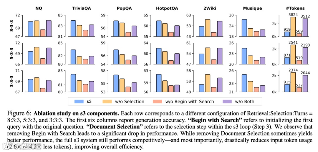 研究团队进一步通过消融实验,验证了 s3 框架中两个关键设计的必要性。实验发现,以用户原始问题作为第一轮检索的起点,有助于模型明确搜索目标、建立有效的检索路径。若不设置这一初始点,搜索策略往往偏离主题,导致性能显著下降。这表明从原始问题出发能够为搜索过程提供正确的导向,确保模型朝着与问题相关的方向进行信息检索。此外,“文档选择” 机制允许模型在每轮检索后主动筛选信息,从而避免将所有检索结果一股脑送入生成器。通过这一设计,s3 的输入 token 平均减少了 2.6 至 4.2 倍,不仅提升了效率,减少了计算资源的浪费,也减少了噪声干扰,对生成效果有正面作用,使得模型在处理信息时更加高效、准确。总体来看,s3 设计中的 “起点初始化 + 动态选择” 是支撑其高效、强泛化性能的关键。即使在某些数据集上通过增加输入内容能获得短期增益,s3 原始结构在训练效率、推理速度与生成准确率上依然展现出更稳定的优势,为实际应用中的搜索智能体训练提供了一种可靠、高效的解决方案。