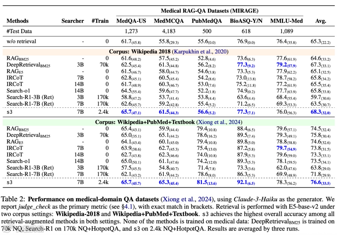 在针对通用 QA 任务的实验中,结果显示 s3 优于 Search-R1 和 DeepRetrieval。团队在六个通用数据集上评估了 Direct Inference、Naive RAG、IRCoT、DeepRetrieval、Search-o1、Search-R1 以及 s3 的性能。实验中,使用了不同的下游 LLM,包括 Qwen2.5-7B-Instruct,Qwen2.5-14B-Instruct 和 Claude-3-Haiku。尽管 s3 仅使用了 2.4k 条 NQ+HotpotQA 训练数据(training source 和 Search-R1 一样),但它在其中五个数据集上实现了最优表现,充分展现出显著的泛化能力,即使在训练数据相对较少的情况下,也能在多种通用数据集上取得良好的效果。