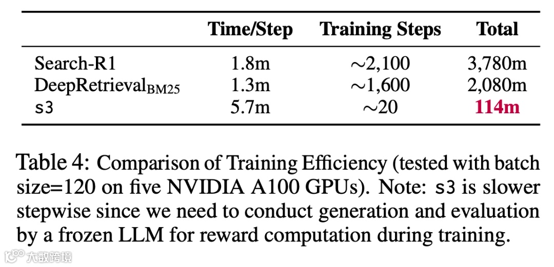 在训练过程中,研究团队采用 PPO(近端策略优化算法)进行策略优化。为了提升训练效率,采取了以下措施:预筛除掉了 “naive RAG 就能答对” 的样本,将训练资源集中在真正需要检索新信息的任务上,避免在简单样本上浪费训练时间与资源;Generator 完全冻结,训练代价完全集中在 Searcher,大大降低了训练的复杂性与成本。通过这些优化,s3 训练总时间只需 114 分钟,而与之对比的 Search-R1 则需要 3780 分钟,同时 s3 所需的数据量也减少约 70 倍,展现出了极高的训练效率。